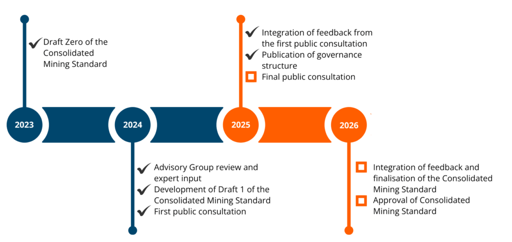 The final version of the Consolidated Mining Standard is expected to be published in 2026, following the conclusion of the final public consultation. Once stakeholder feedback has been reviewed and integrated, the Consolidated Mining Standard will be formally approved by a multi-stakeholder board, marking its official launch as a unified benchmark for responsible mining.