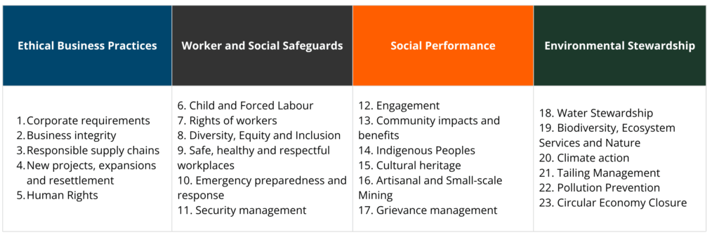 The Consolidated Mining Standard is structured around the 24 Performance Areas listed above, each of which will be assessed across three progressive levels: