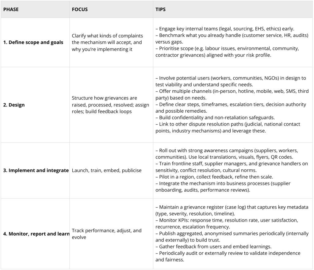 Below is a practitioner-oriented roadmap for creating a grievance mechanism that can be a forward-looking tool for responsible business.